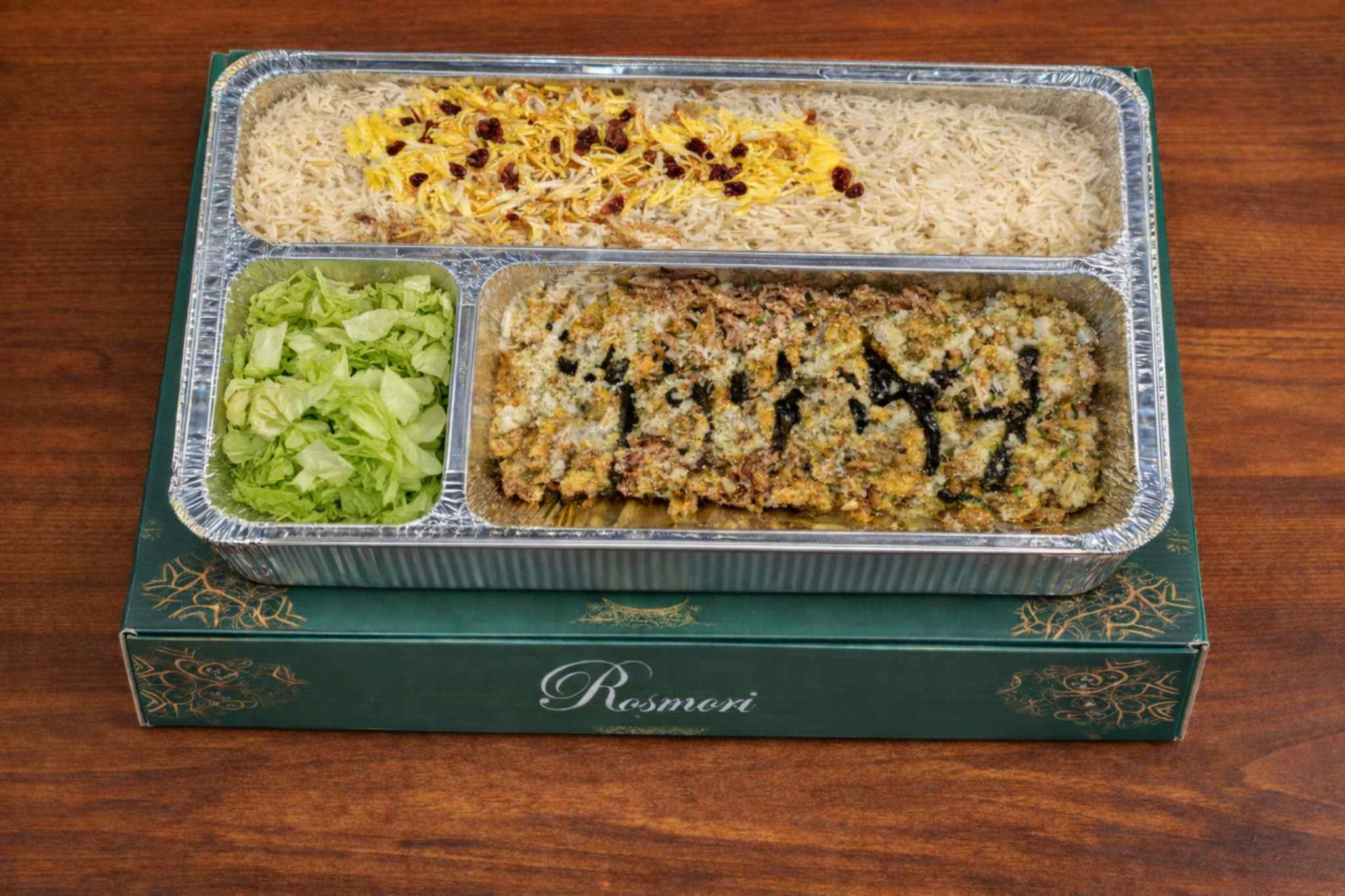 Chopped and pan-fried eggplant with whey yogurt, mint, and onions, seasoned with Persian spices, served with basmati saffron rice