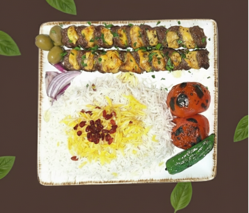 A platter with two minced lamb skewers, one chicken breast skewer, and one marinated lamb loin skewer, served with rice
